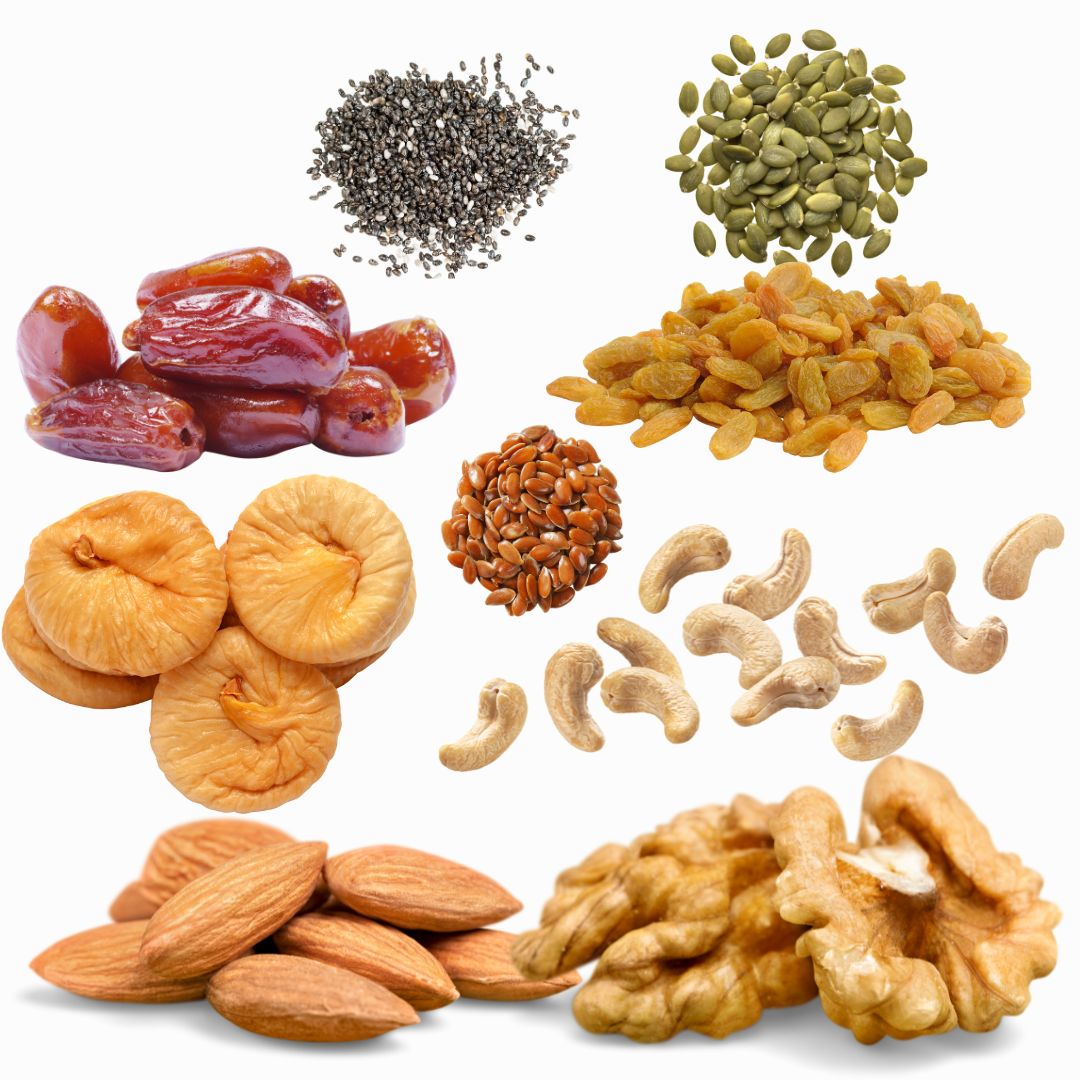 Almond, Walnut, Cashew, Fig, Raisins, Dates, Flax Seeds, Chia Seeds, Pumpkin Seeds